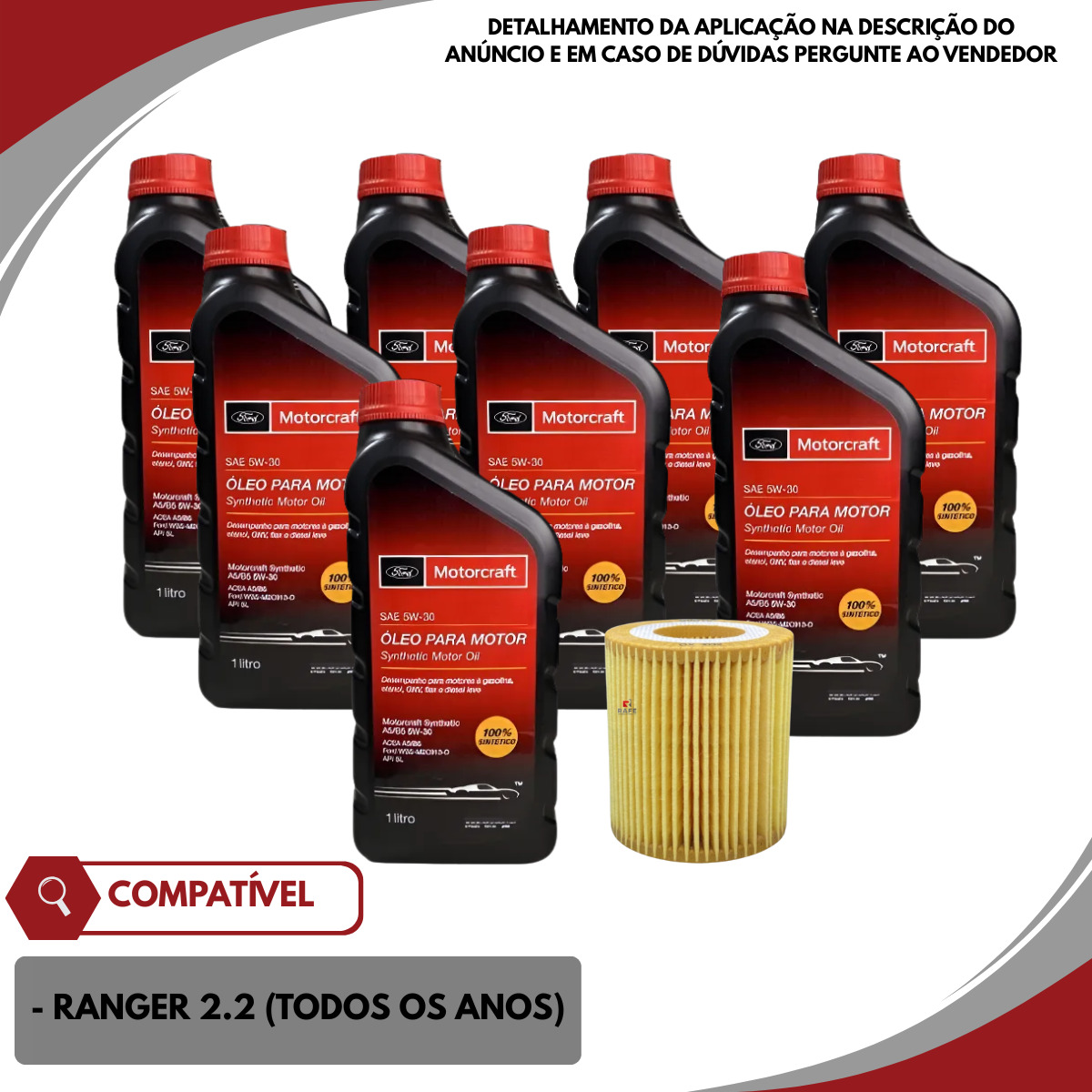 Kit para troca de óleo de motor Ford Ranger 2.2 (todos os anos) com 8 litros de óleo sintético para motor 2.2l 5w30 – Motorcraft e 1 filtro de óleo Mahle